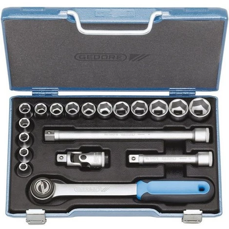 Composition de douilles 1/2”, 19 pièces, 6 pans, 19 pièces- Chromé mat – Acier au vanadium GEDORE 31CRV3 Livraison : dans un coffret métallique avec un insert en plastique.