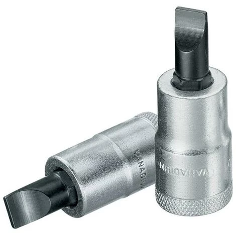 carré d’entraînement de 12,5 mm (1/2″) · pour vis à fente · socle en acier au vanadium · lame en acier spécial phosphaté au manganèse · moleté · avec rainure gorge à bille · Lame selon DIN ISO 2380-1 forme B